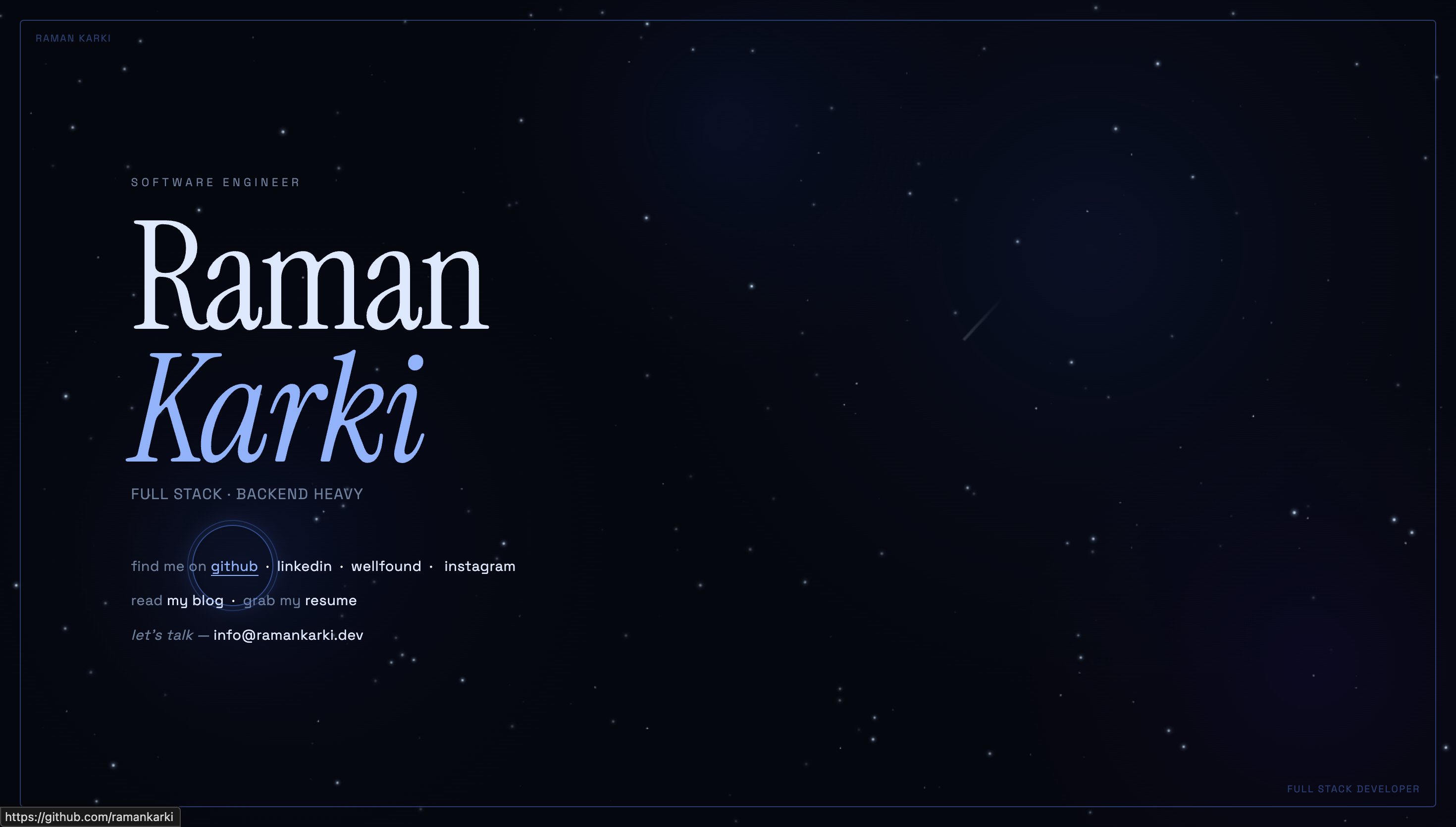 My idea was simple: a minimal single-page, single-screen website that just reflects who I am and what I do. Nothing bloated. Just my name, my job title, and links — GitHub, LinkedIn, Instagram, my blog, and my resume URL. That's it. And something to make it feel alive, like a 3D animation or an aesthetic theme.